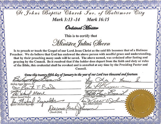 Pastor Shern was examined by an ordination panel of Baptist Pastors led by the now retired Bishop Aggie Brown, SR at The Great Dalton Baptist Church of Baltimore. Pastor Shern passed his ordination exam with a score 98% and was awarded his Certification of Ordination, signed by all members of the examination panel, on January 25th 2014.